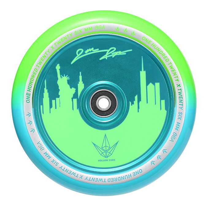 Jon Reyes Signature wheel with NEW Green/Teal New York skyline. Featuring a unique black and white dual-tone 120mm x 26mm wide poly-urethane.
